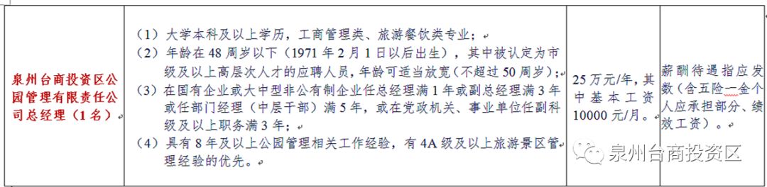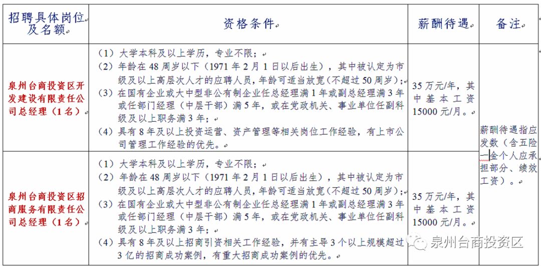 5、符合岗位资格条件,具体招聘条件和薪酬待遇详见《泉州台商投资区公开招聘区属国有企业总经理情况一览表》。