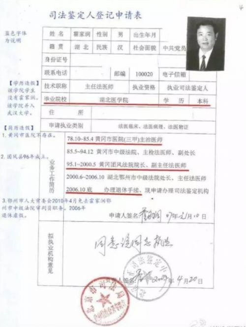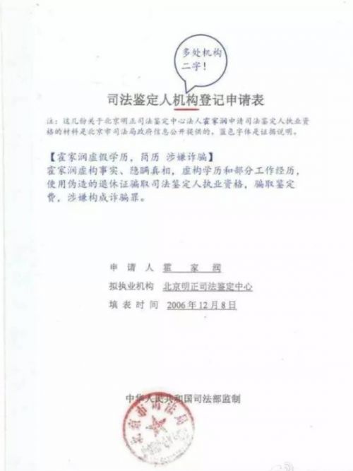 网友“老张没说法”贴出霍家润的《司法鉴定人登记申请表》和毕业文凭,并在图片中注明,“湖北医学院没有霍家润”,霍家润毕业时间与校长任期冲突等问题。