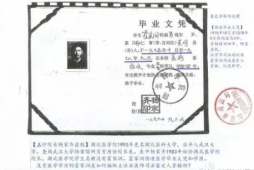 此外,武汉大学档案馆的工作人员介绍,一般情况下,1975年至1978年期间,在该校学习的学生应该属于工农兵学员,学制为三年,在毕业文凭上不可能使用“本科”的说法。杨家齐校长在1983年才担任湖北医学院院长,不可能在1978年的毕业文凭上盖上自己的印章。如果属于在杨家齐校长任职期间补办毕业文凭,也不会使用“本科”的说法,该校档案馆工作人员表示对该毕业证存疑。
