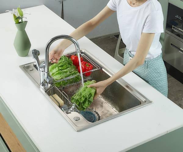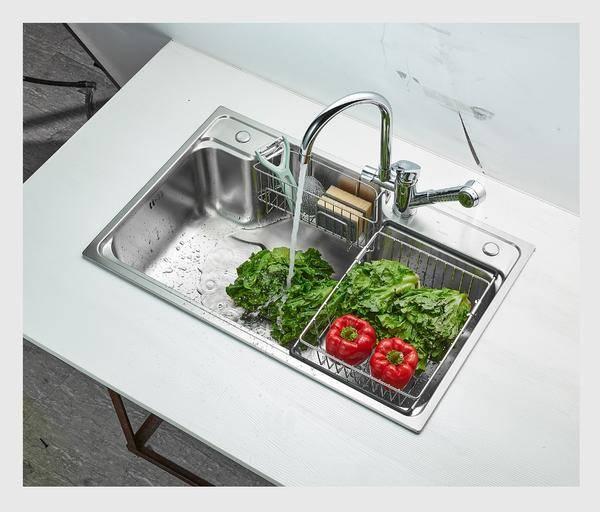 双槽虽然空间大,但无法分区也确实是一个缺点。为此卡贝为其单独配备了伸缩篮和挂篮。伸缩篮可以在一定程度上充当小单槽,平时用来给碗碟沥水或是盛放蔬菜水果都是不错的。前置的挂篮则可以放置一些清洁用具,进一步扩展了收纳空间。