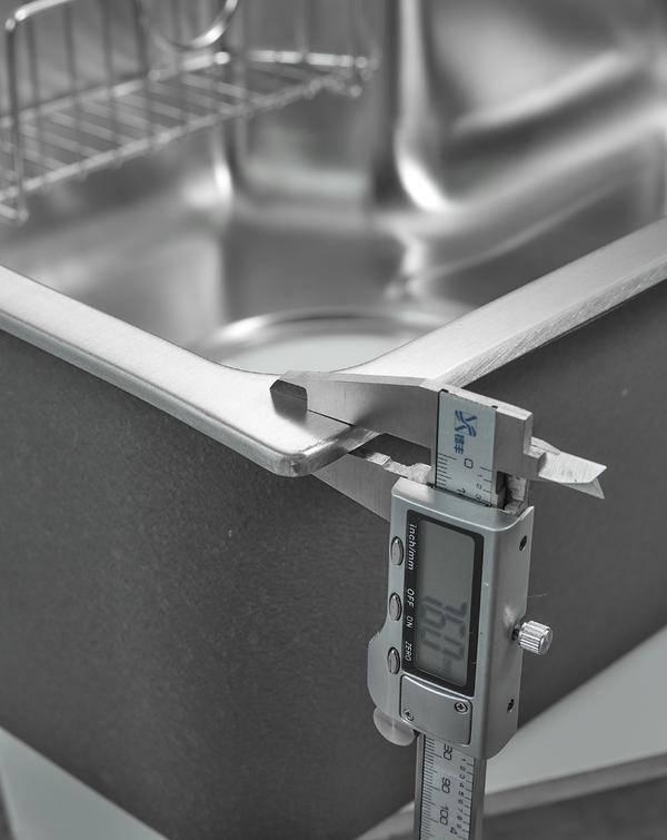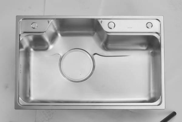 从卡尺的测量结果来看,水槽的厚度在0.8mm左右,属于比较厚重的类型,用力按下未发生任何变化,建议大家在选购的时候,用这种方法来检验钢材的厚度,越厚的水槽越有利于长期使用。