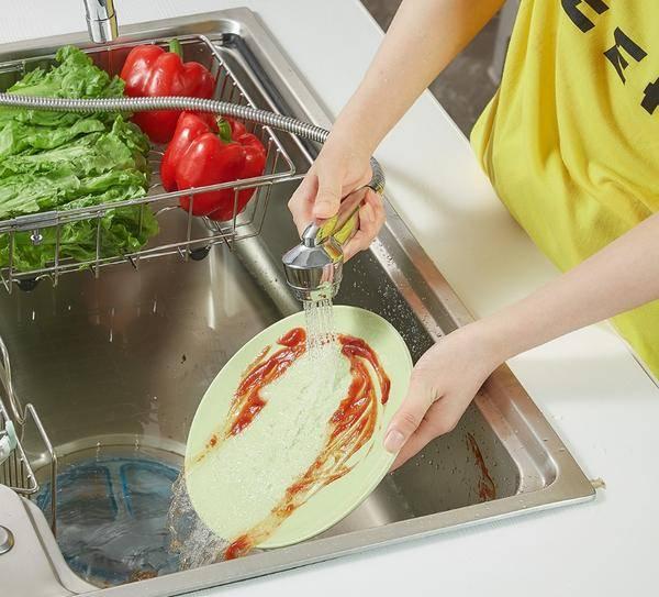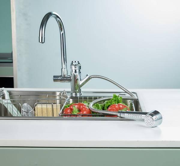 这款水槽搭配了抽拉式龙头(型号98253),龙头表面的电镀光泽度较好,颜值不错。使用时可以自由伸缩,不管是清洁水槽还是洗菜洗碗都比较方便。抽拉龙头上有增压按钮,按下就能增强出水效果,清洁效果更出色。